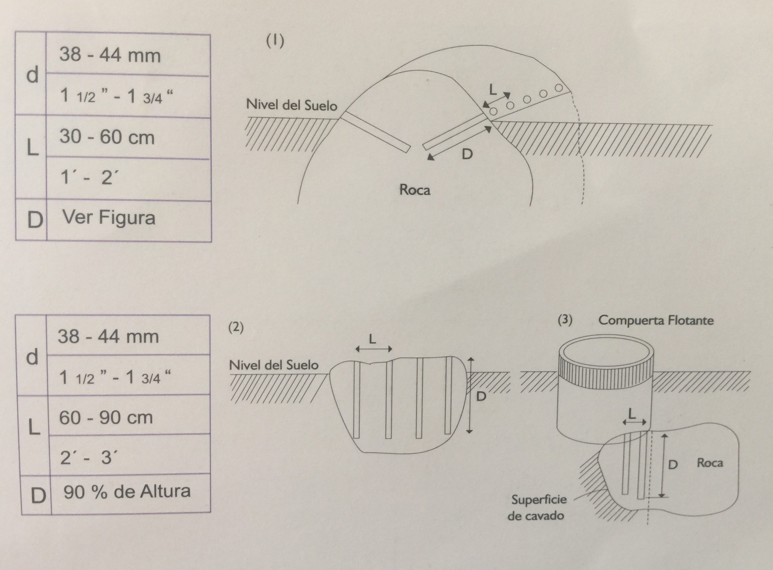 En la figura siguiente, se da ejemplos de la forma de perforación en una roca , separación de los barrenos y el sentido que actua el expansivo.